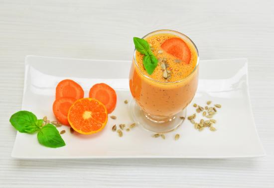Wallpaper A glass of carrot cocktail with orange on a white plate