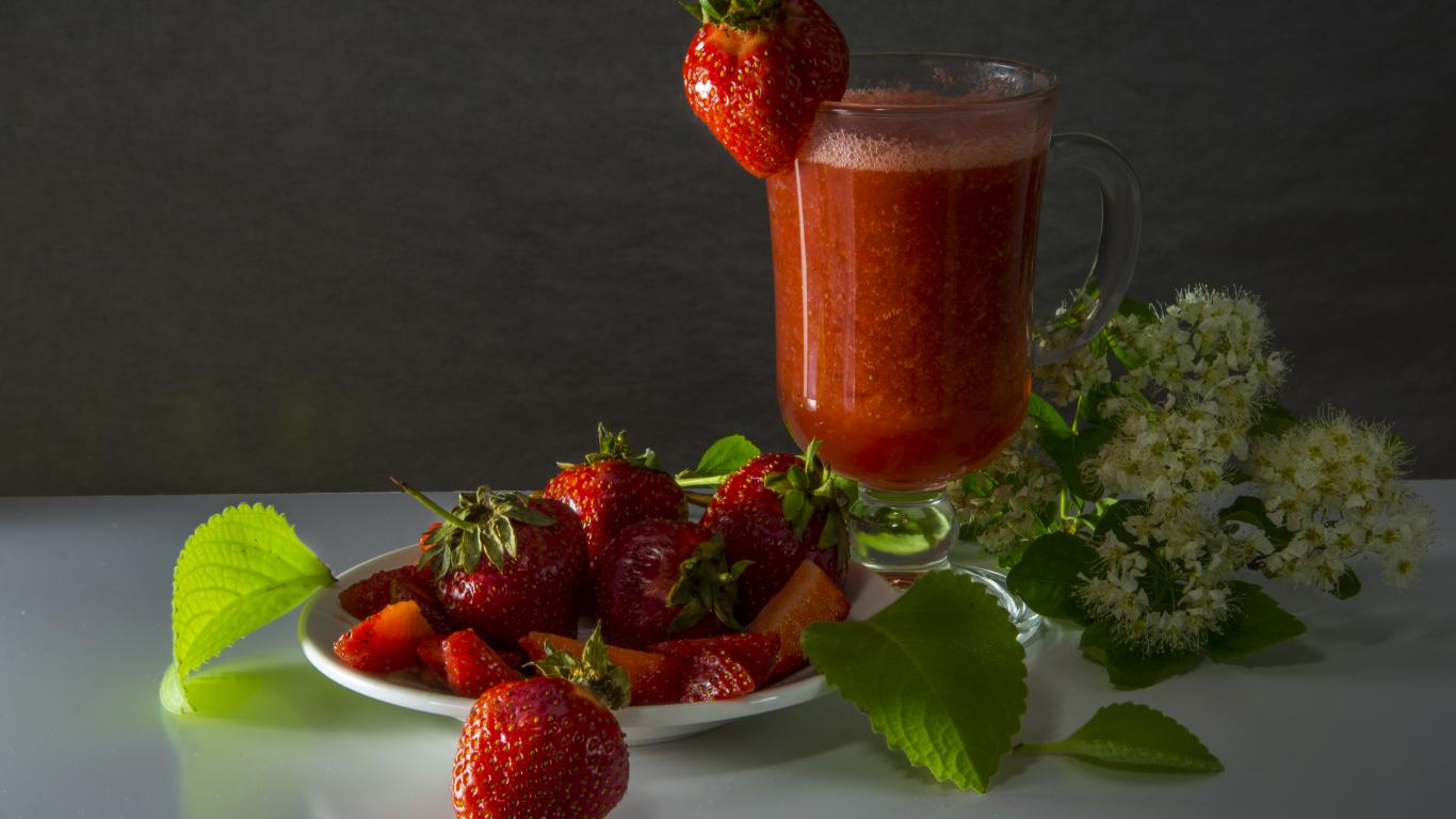» Wallpaper A glass of strawberry juice and fresh strawberries on a table