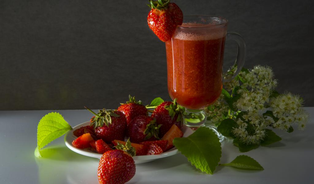 » Wallpaper A glass of strawberry juice and fresh strawberries on a table