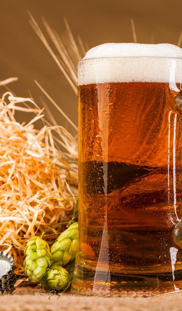 Wallpaper A glass of beer with foam on the table with hops and straw