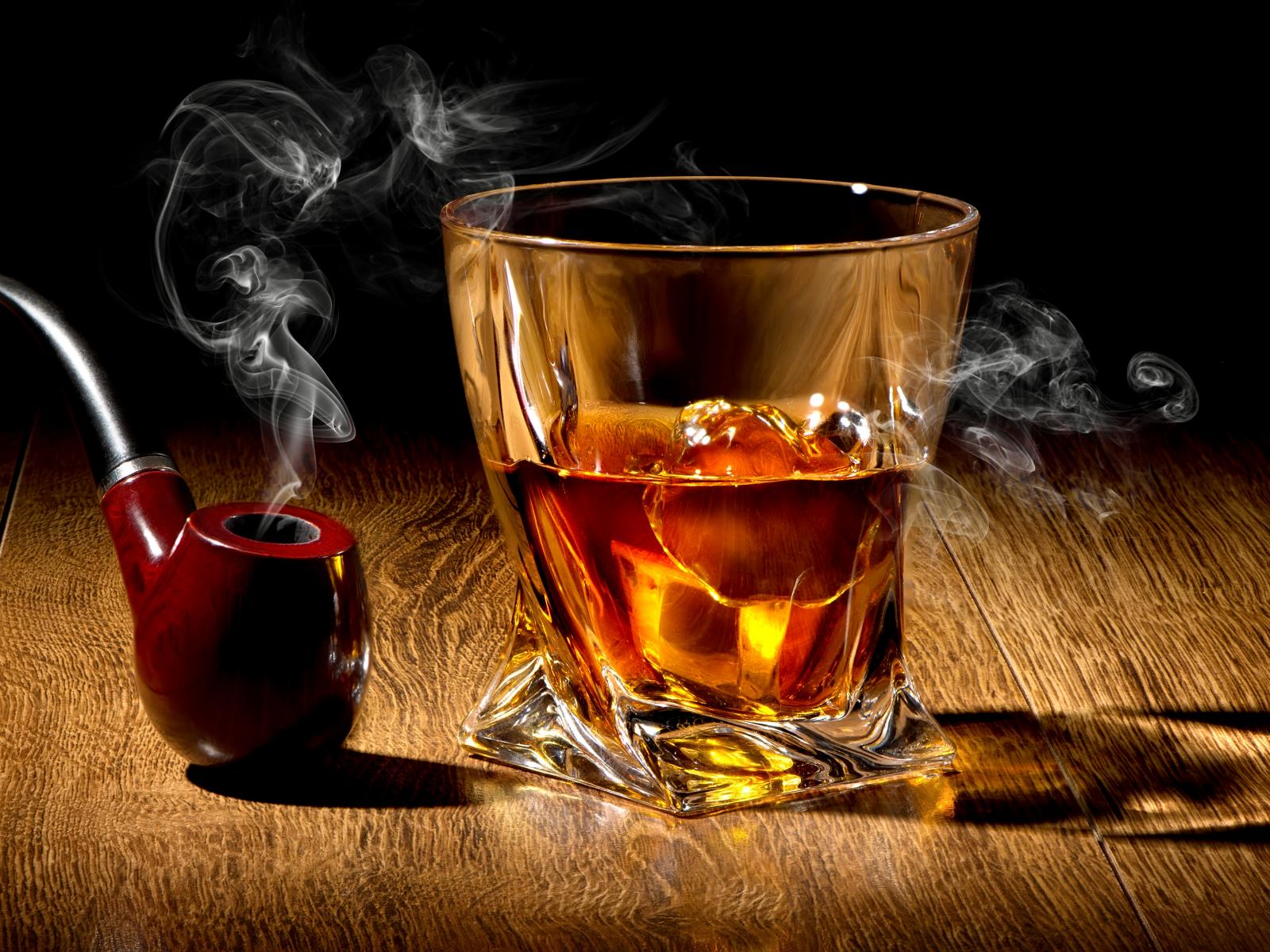 Wallpaper A glass of whiskey with ice on the table with a smoking tube