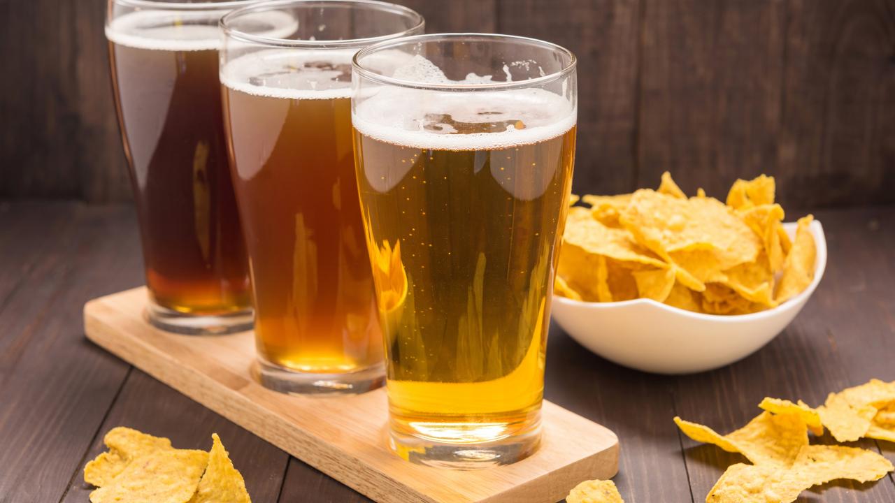 Wallpaper Three glasses of beer on a table with chips