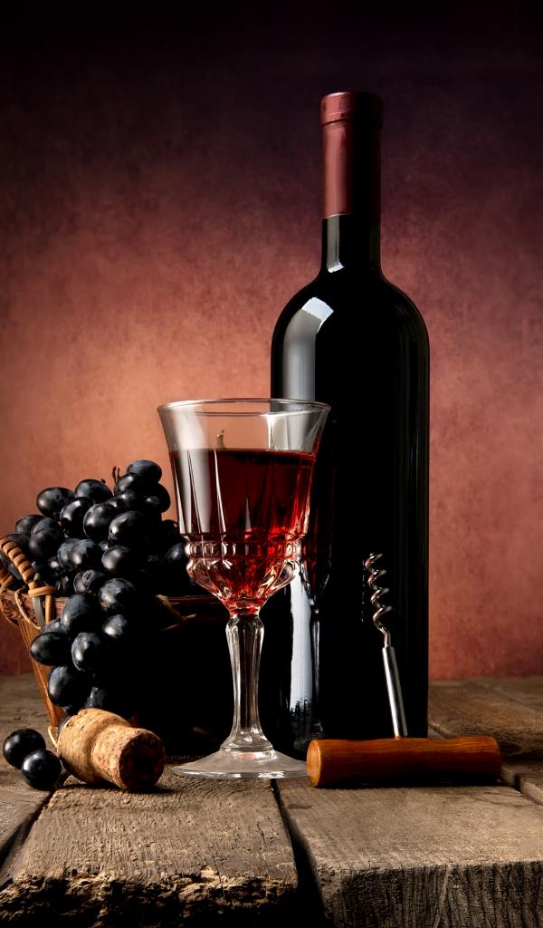 Wallpaper A bottle of red wine on a table with a glass and blue grapes