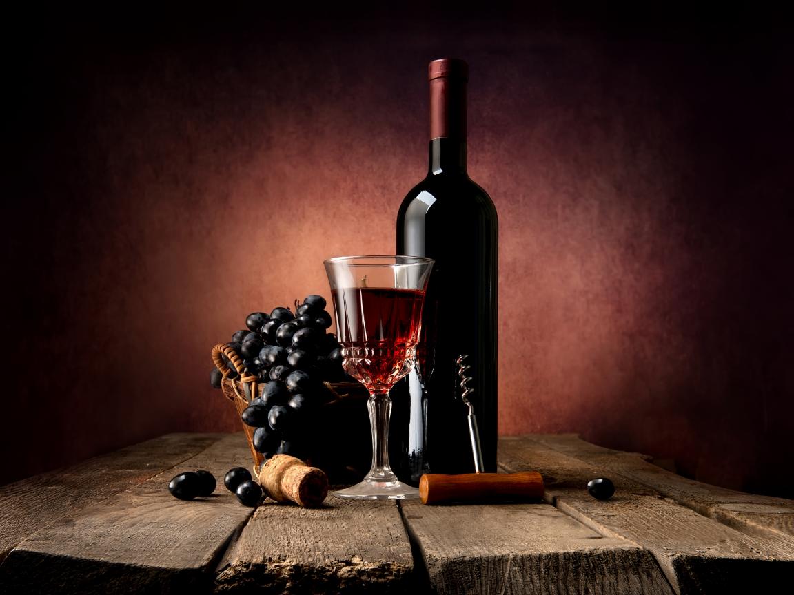 Wallpaper A bottle of red wine on a table with a glass and blue grapes