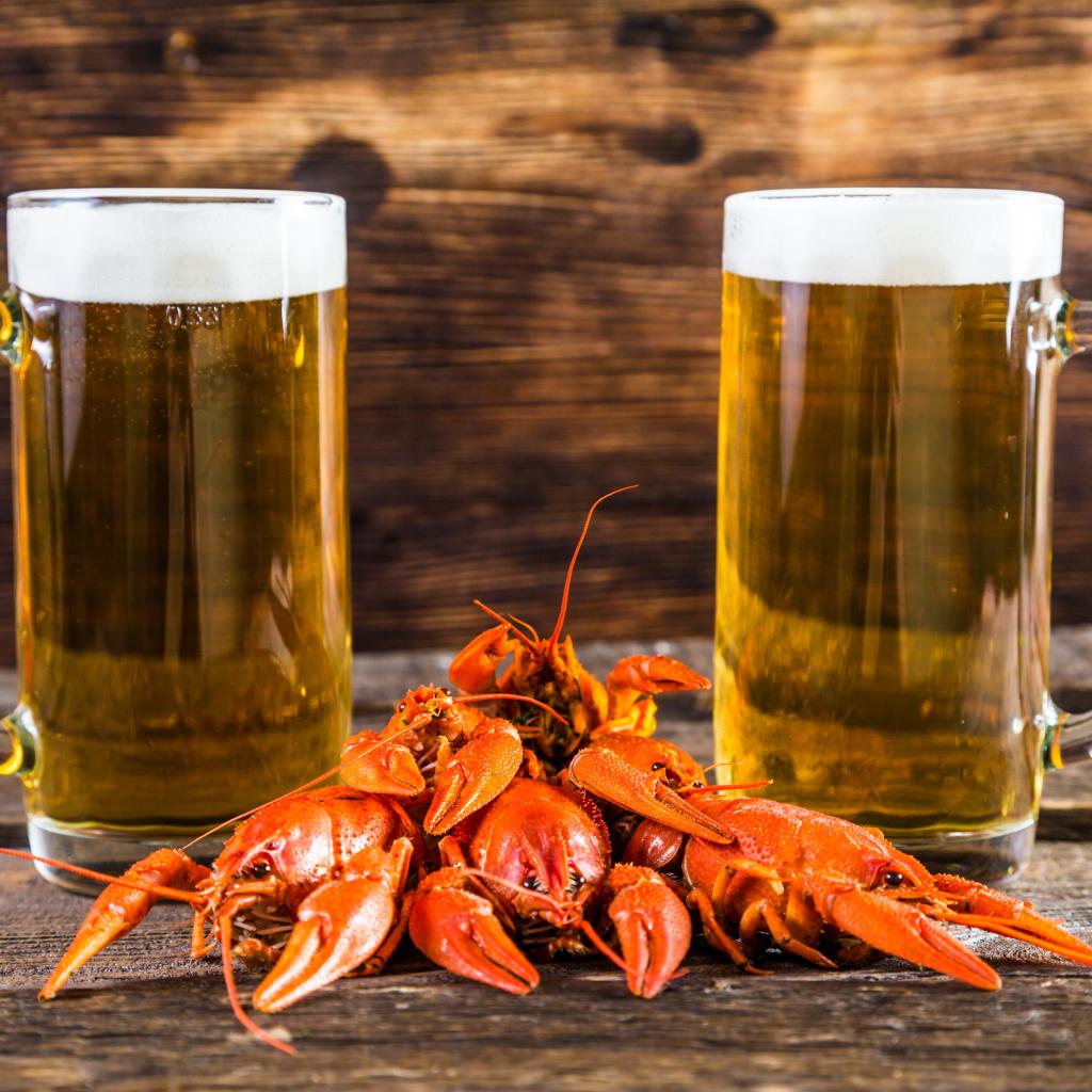 Wallpaper Two glasses of beer with red crawfish on the table