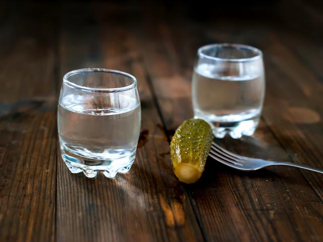 Wallpaper Two glasses of vodka and a pickled cucumber on the table