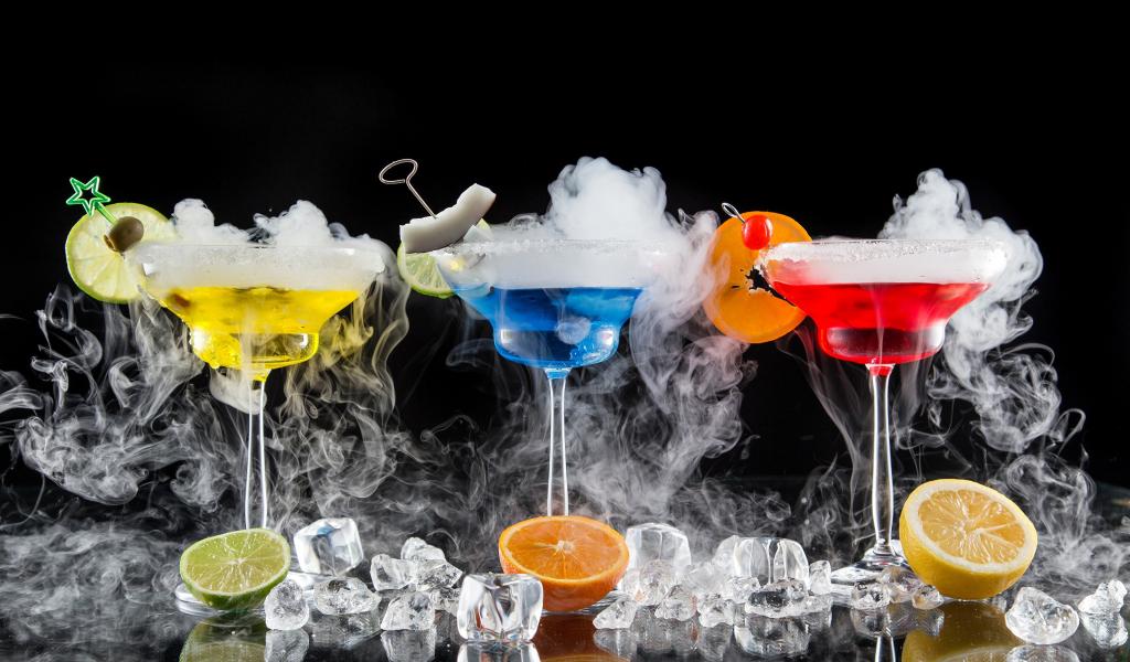 Wallpaper Three alcoholic cocktails with dry ice on a black background