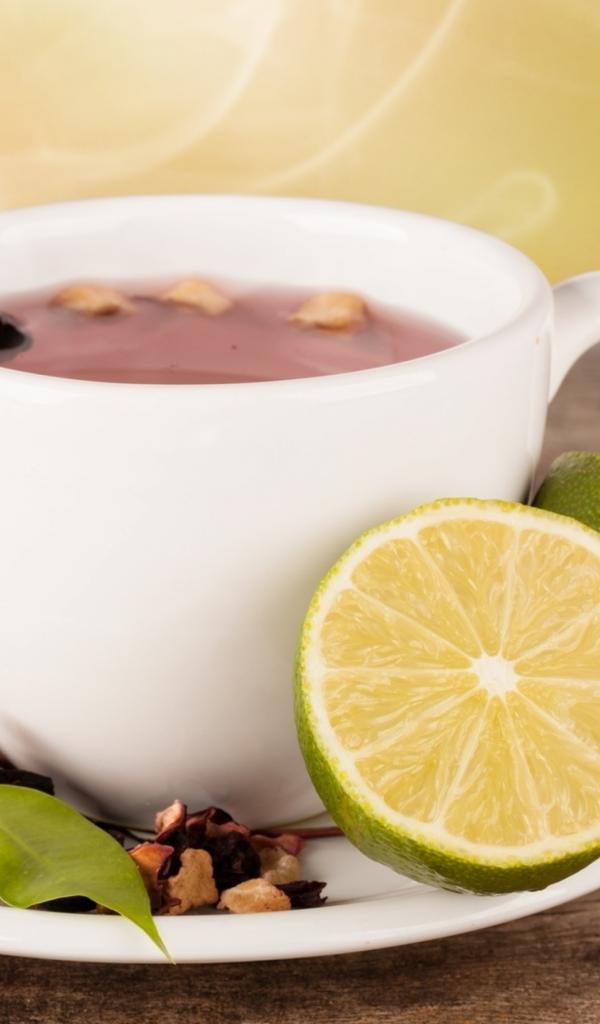 Wallpaper White cup of tea with slices of lime on a white saucer