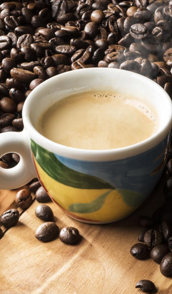 Wallpaper A cup of hot coffee with coffee beans on the table