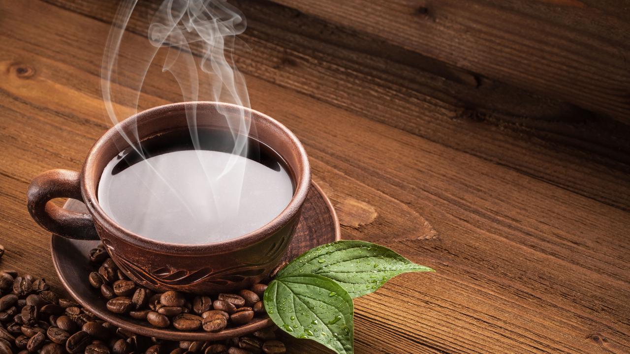 Wallpaper A cup of hot coffee with grains on a wooden table