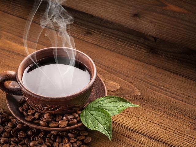Wallpaper A cup of hot coffee with grains on a wooden table