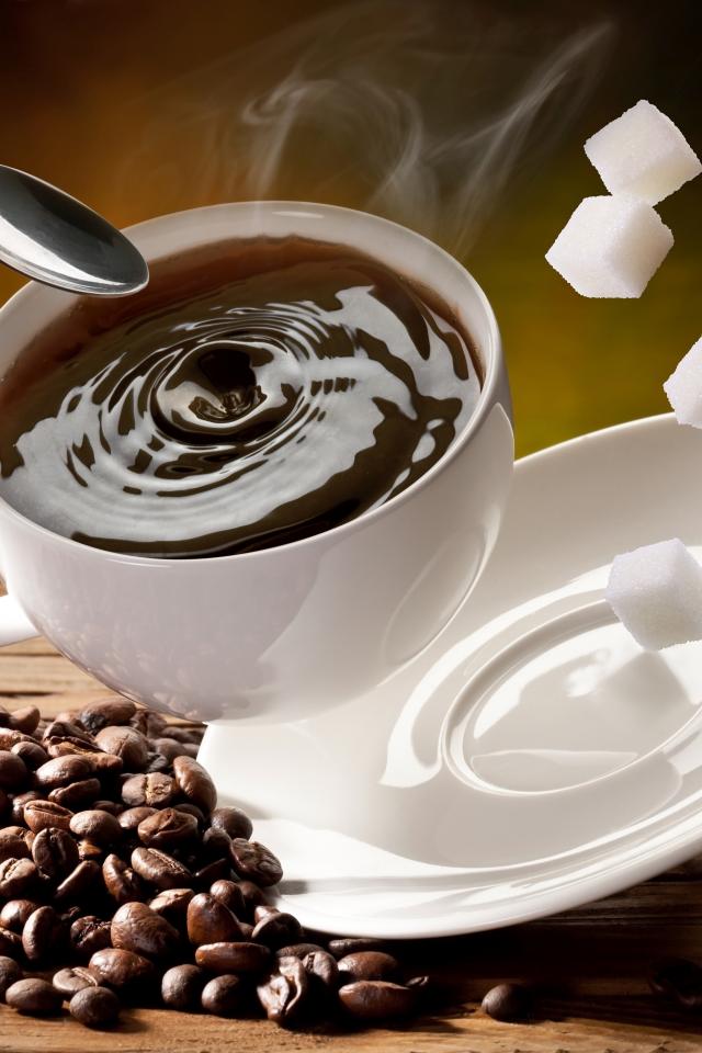Wallpaper White cup with coffee falls on a table with coffee beans