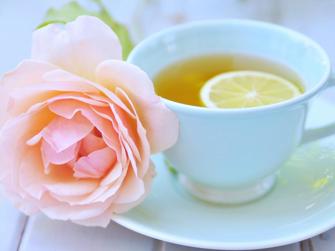 Wallpaper White cup of tea with lemon and pink rose