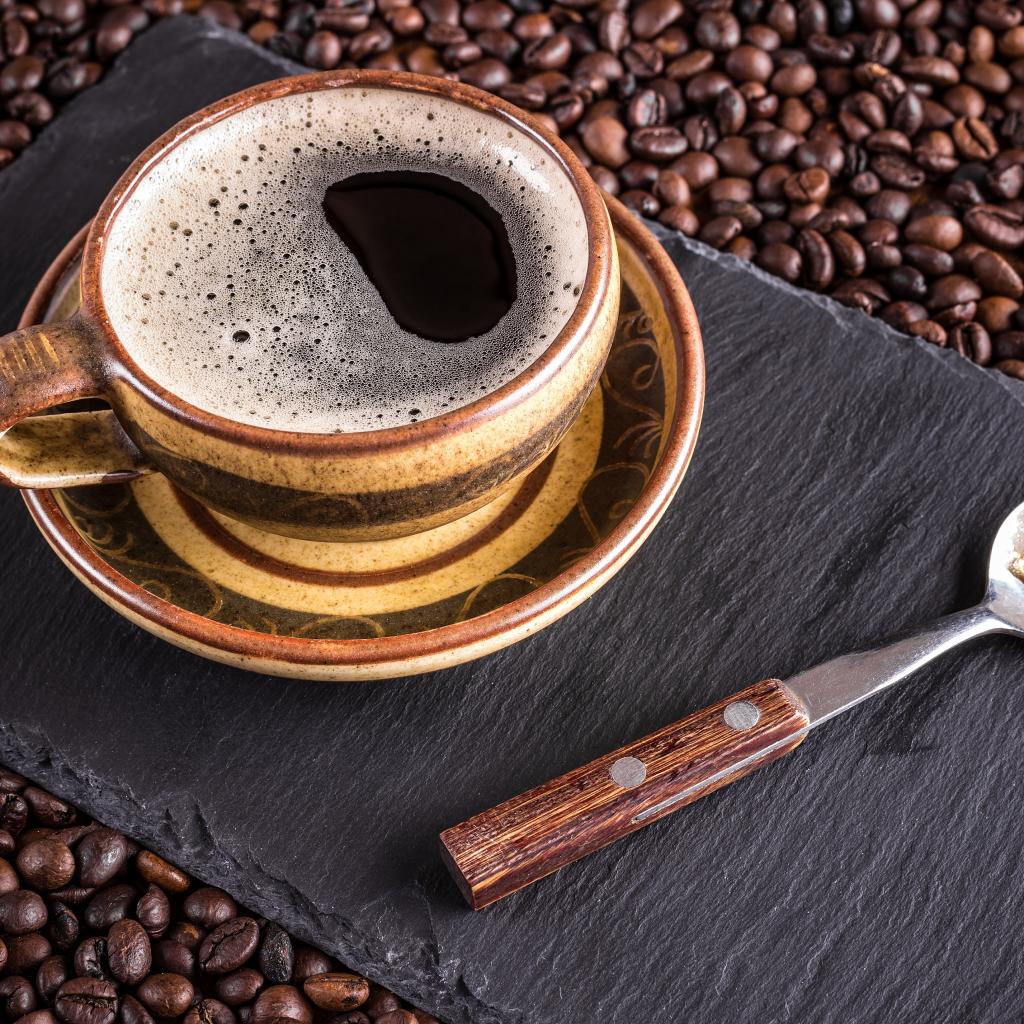 Wallpaper A large cup of coffee with a teaspoon is on coffee beans