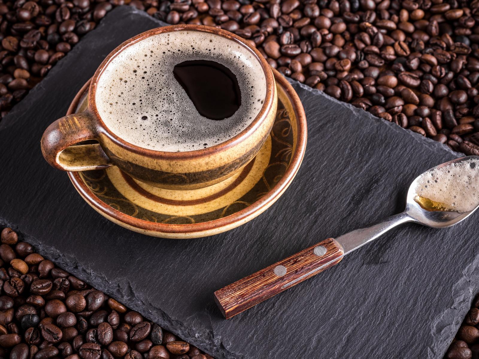 Wallpaper A large cup of coffee with a teaspoon is on coffee beans