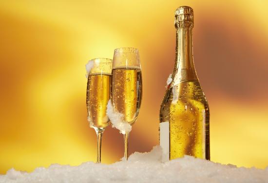 Wallpaper A bottle of champagne and two wine glasses stand on white snow