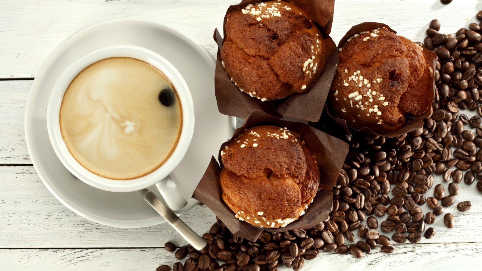 Wallpaper A cup of coffee with cupcakes and coffee beans on the table