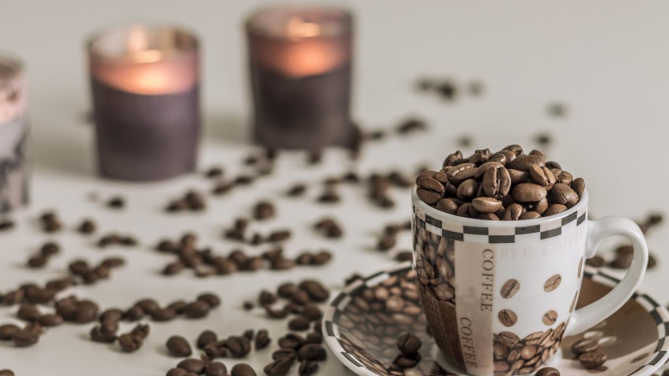 Wallpaper Cup with coffee beans on a table with candles