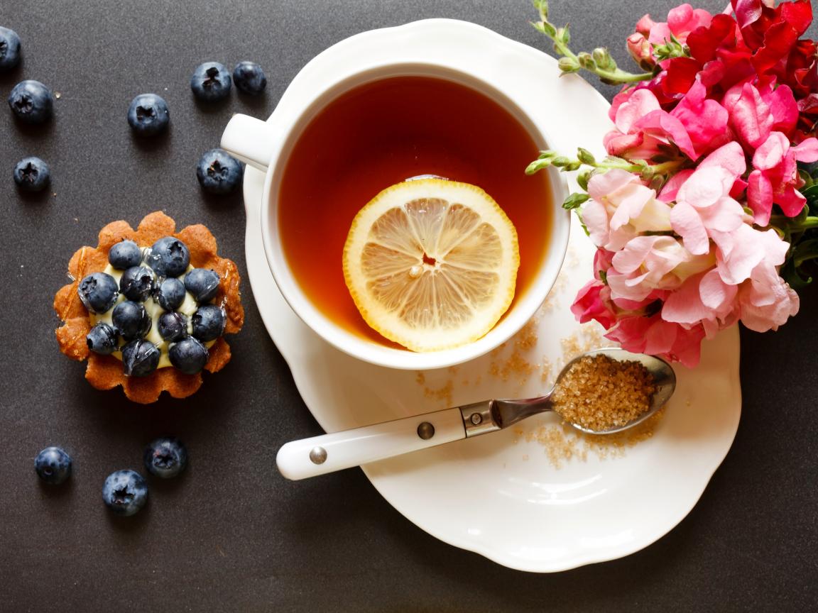Wallpaper A cup of tea with lemon on a table with a cupcake and flowers