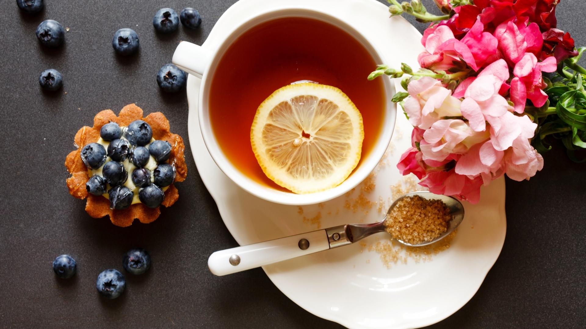 Wallpaper A cup of tea with lemon on a table with a cupcake and flowers