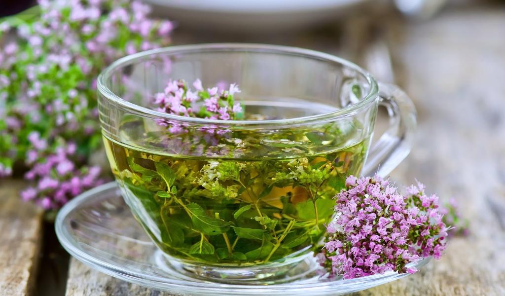 Wallpaper Glass cup of green tea with thyme flowers