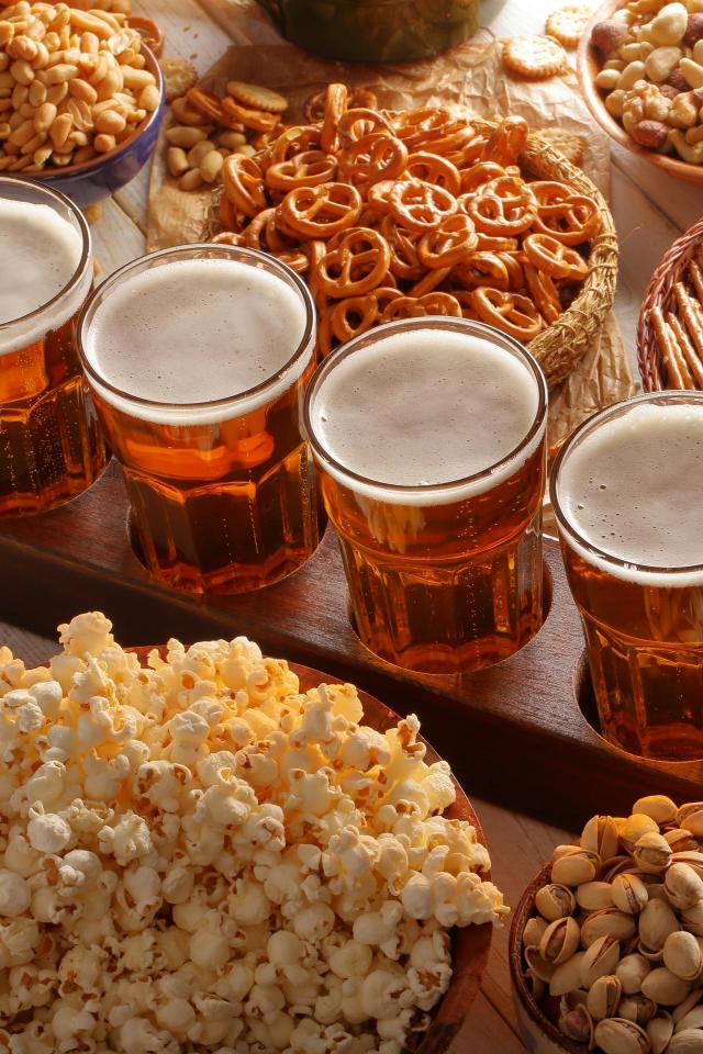 Wallpaper Beer with nuts, pistachios, popcorn and cookies on the table