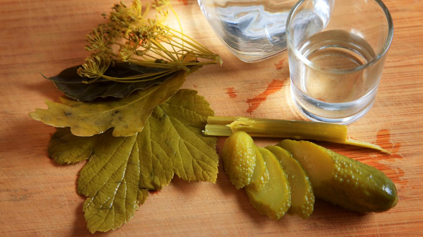 Wallpaper A glass of vodka on a table with pickled cucumber