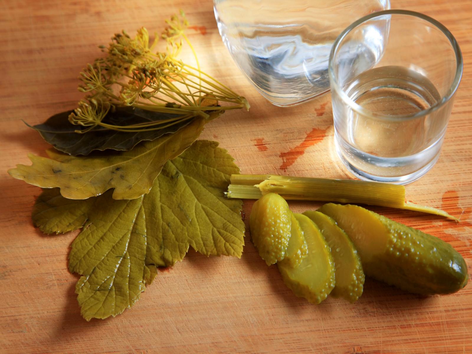 Wallpaper A glass of vodka on a table with pickled cucumber