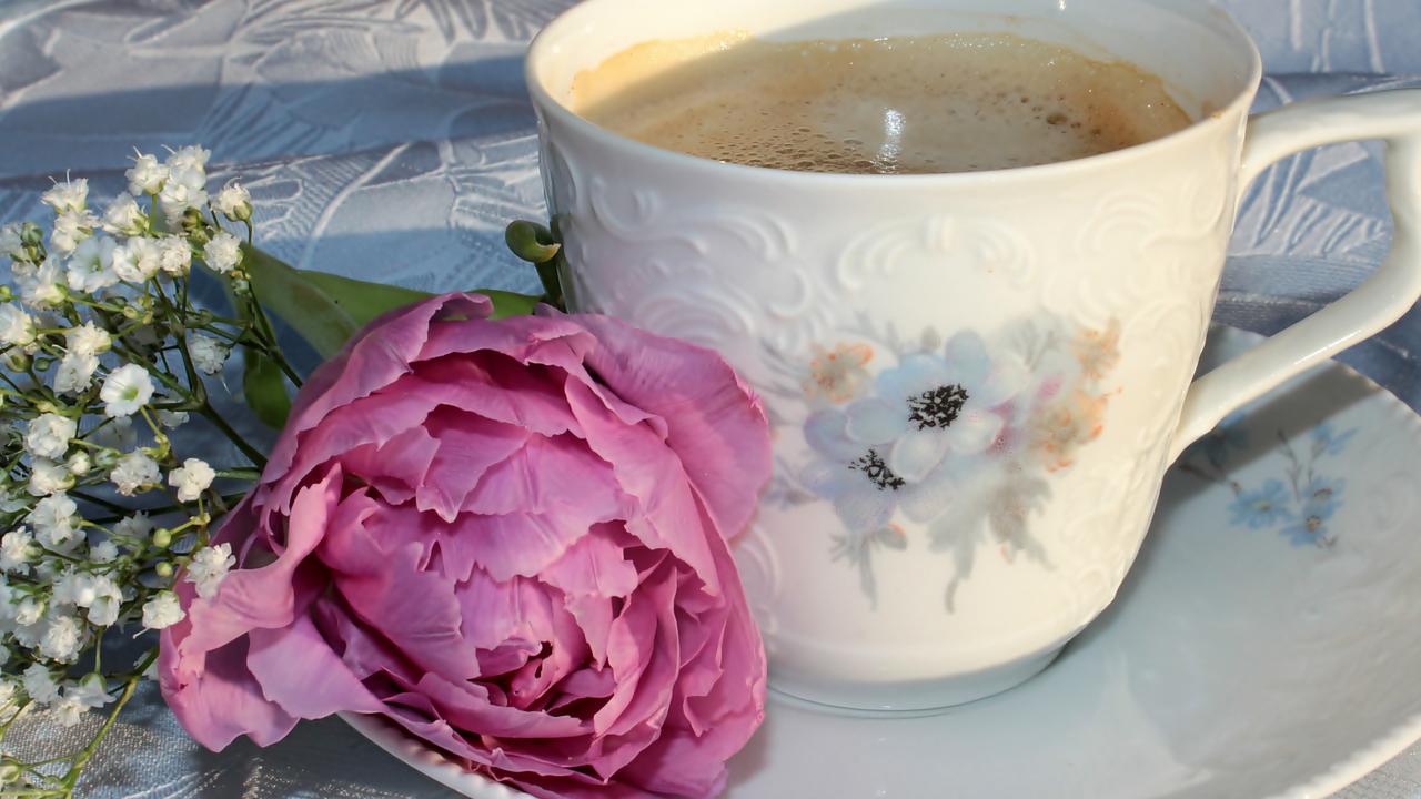 Wallpaper A cup of coffee with a pink peony flower and white flowers