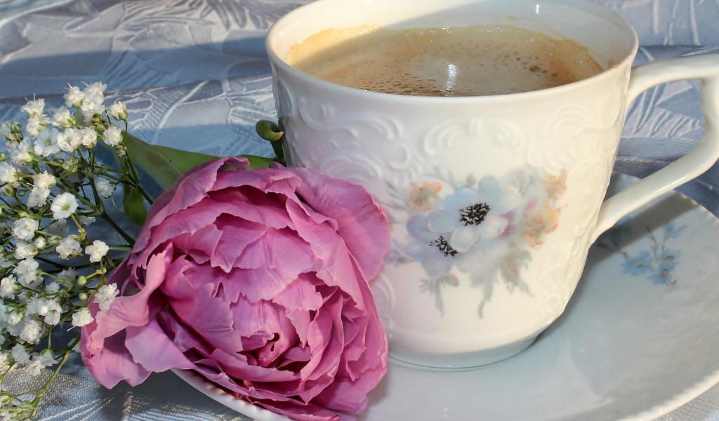 Wallpaper A cup of coffee with a pink peony flower and white flowers
