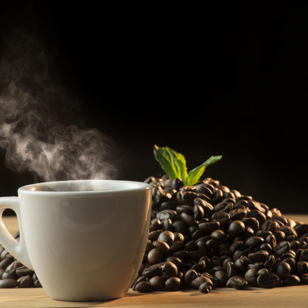 Wallpaper Coffee beans on a table with a cup of hot coffee