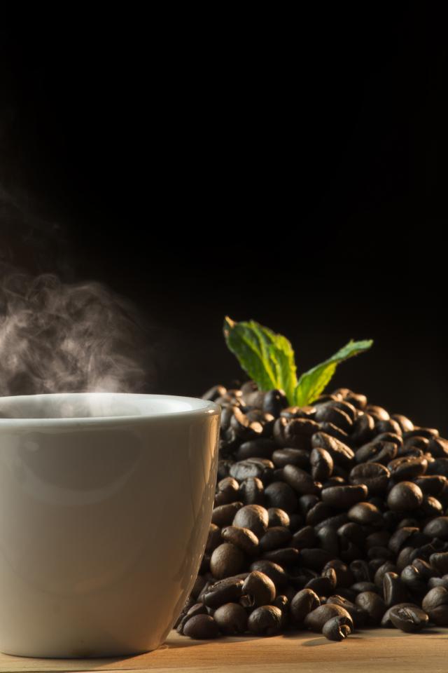 Wallpaper Coffee beans on a table with a cup of hot coffee