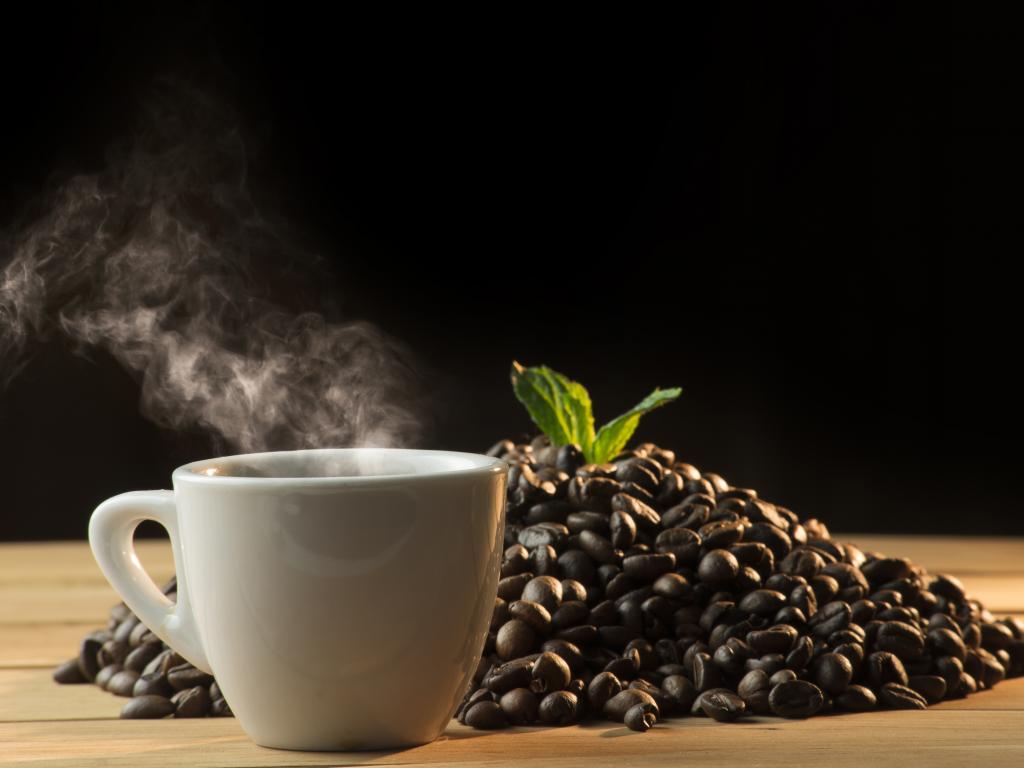 Wallpaper Coffee beans on a table with a cup of hot coffee