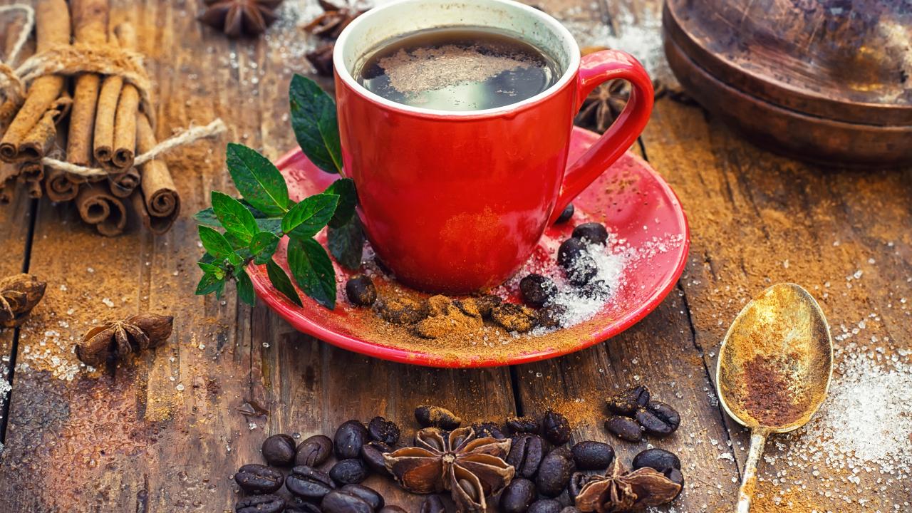 Wallpaper A cup of coffee on a table with grains, cinnamon and bean grains