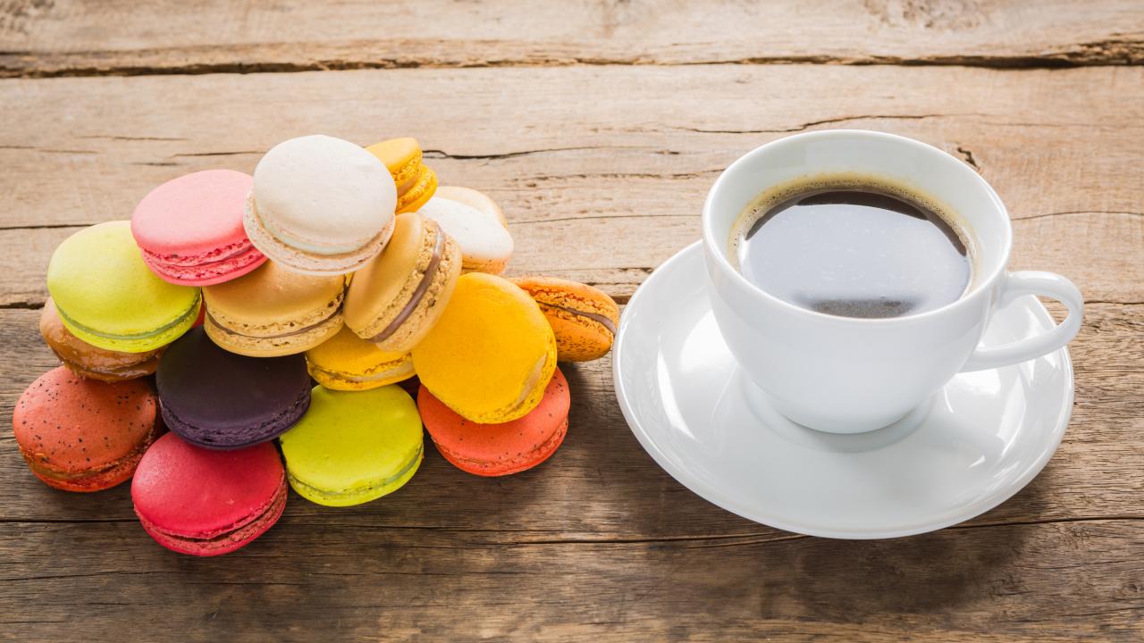 Wallpaper A cup of coffee on a table with multicolored macaroons