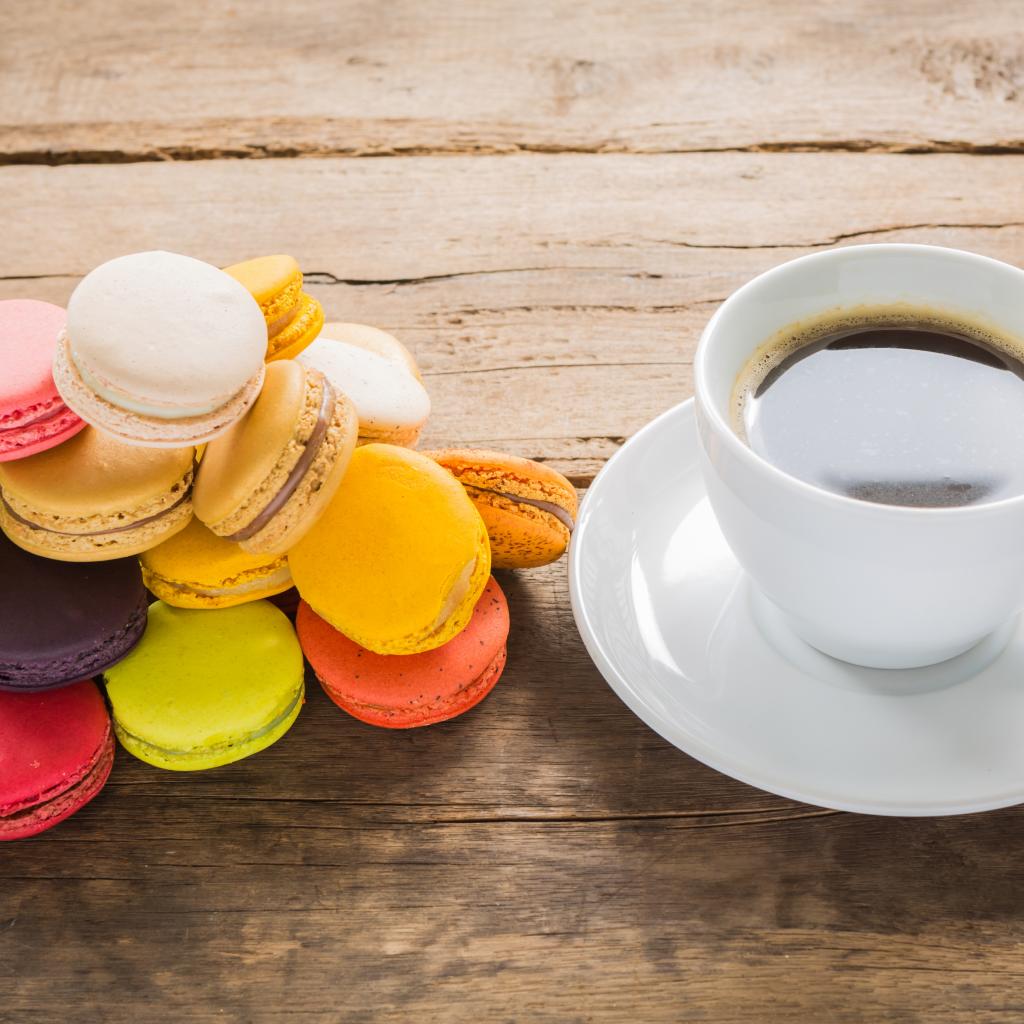 Wallpaper A cup of coffee on a table with multicolored macaroons