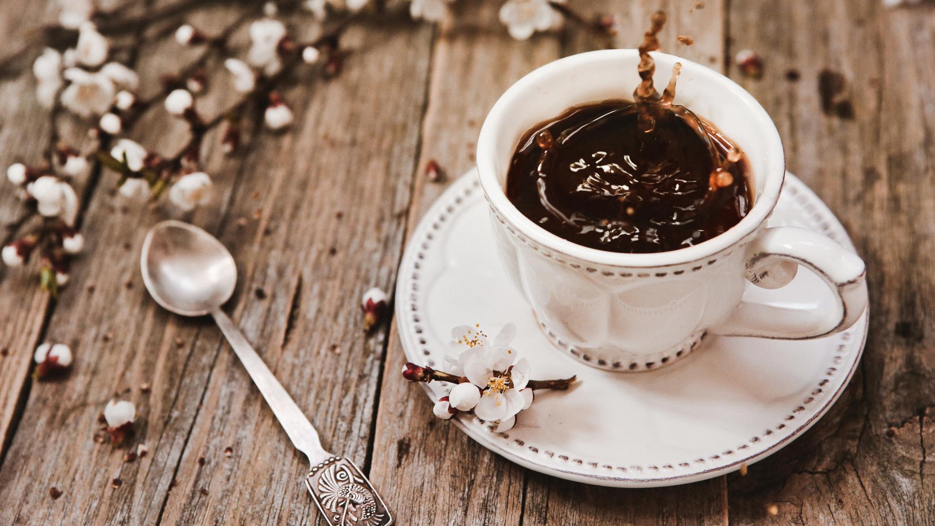 Wallpaper A cup of coffee on a table with flowers of apricot
