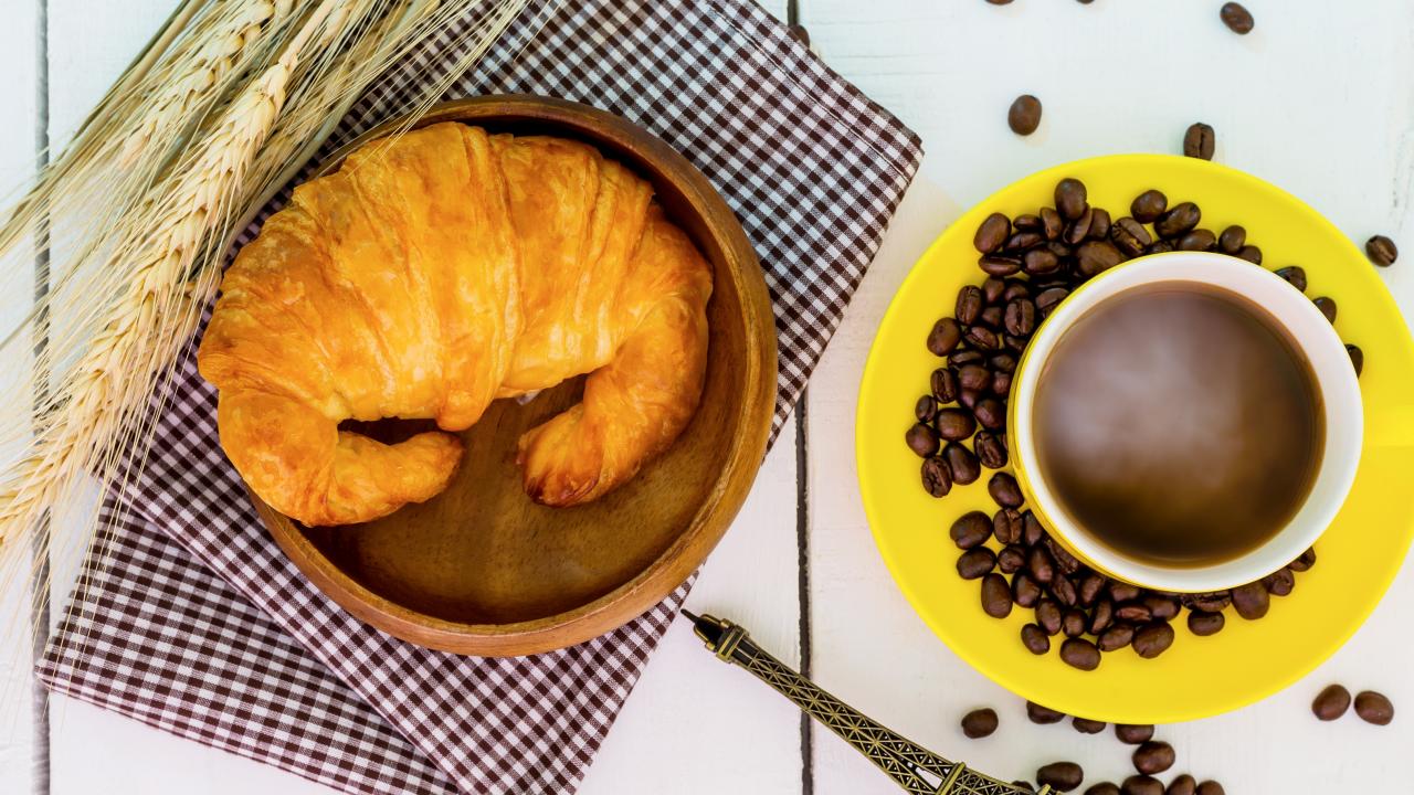 Wallpaper A cup of coffee on a table with a fresh croissant
