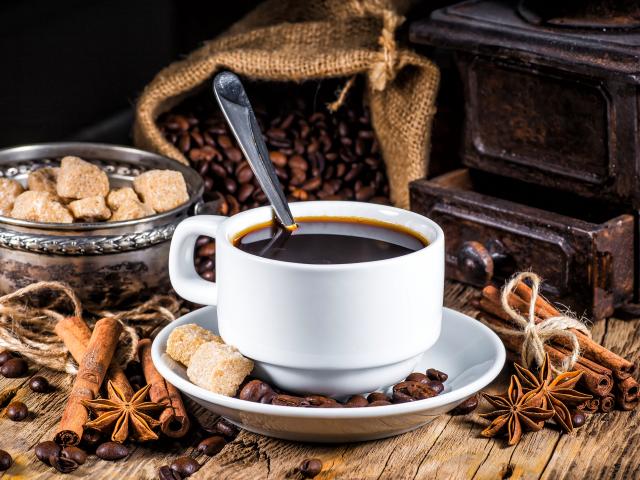 Wallpaper White cup of coffee on a table with sugar, cinnamon and badan