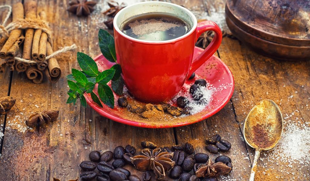 Wallpaper Red coffee cup on a table with grains and bean and cinnamon