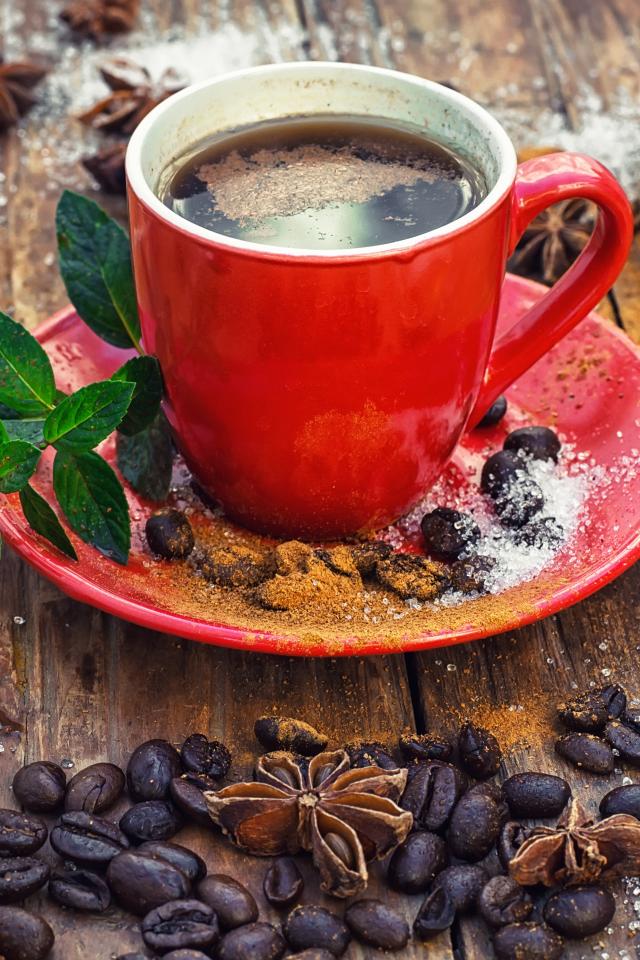 Wallpaper Red coffee cup on a table with grains and bean and cinnamon