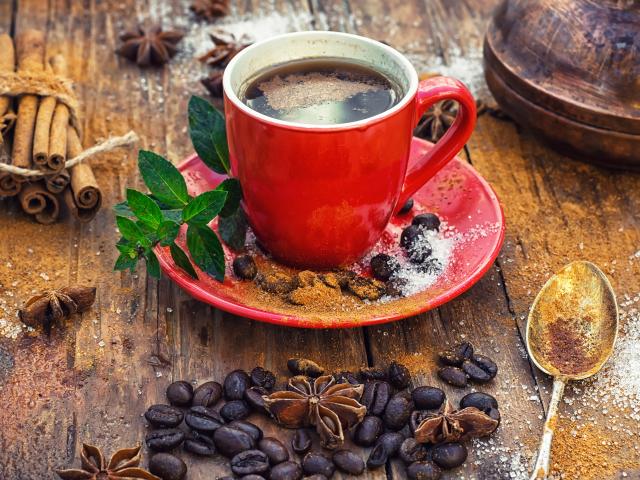 Wallpaper Red coffee cup on a table with grains and bean and cinnamon