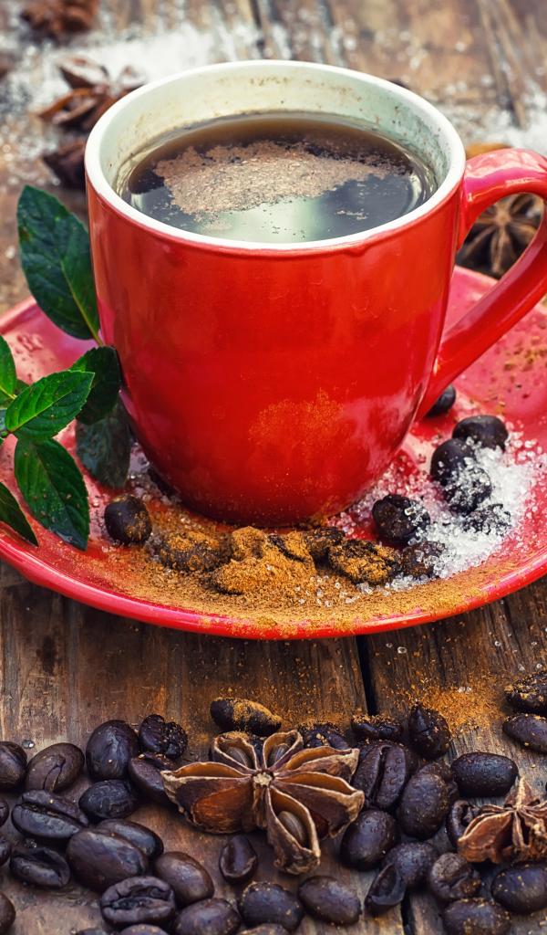 Wallpaper Red coffee cup on a table with grains and bean and cinnamon