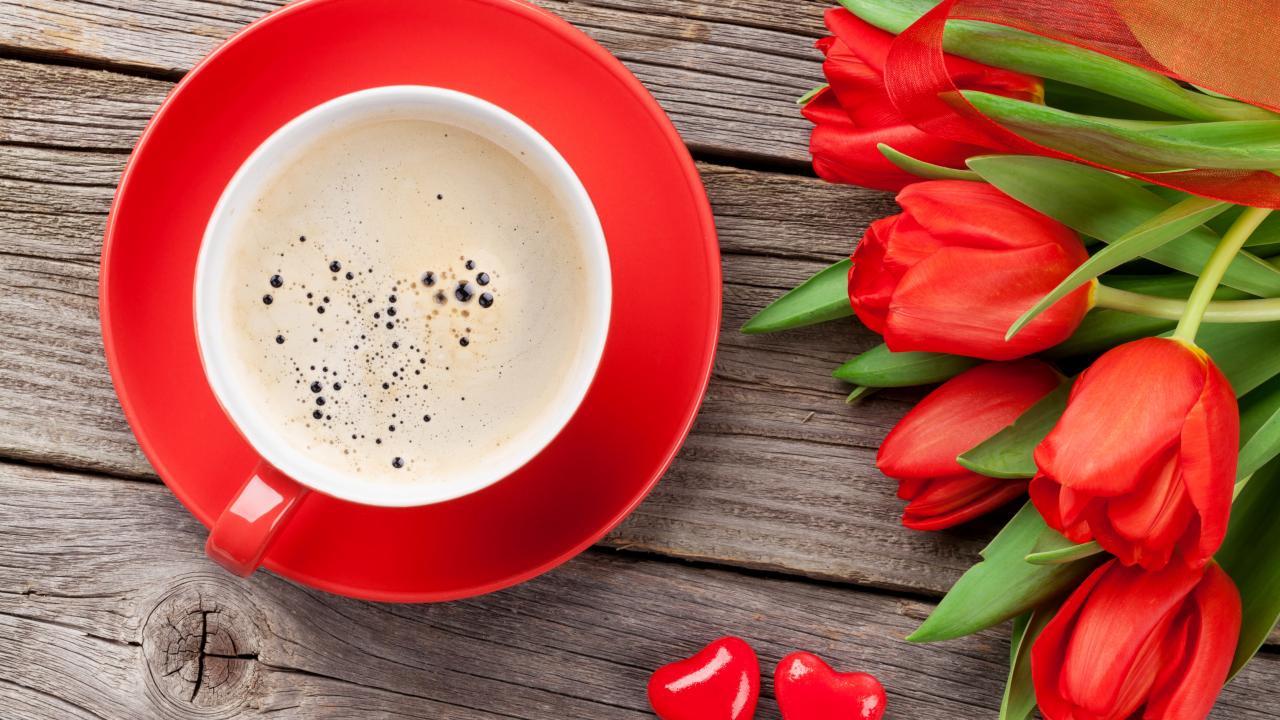 Wallpaper A cup of coffee with red tulips on a wooden table