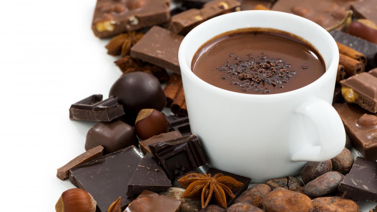 Wallpaper Hot chocolate in a white cup on a table with nuts