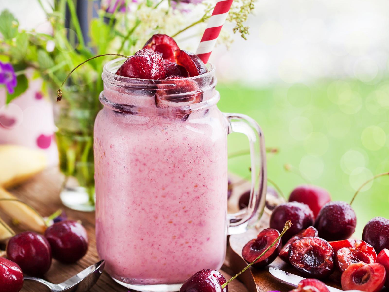 Wallpaper Smoothies in a bottle with a straw and a sweet cherry