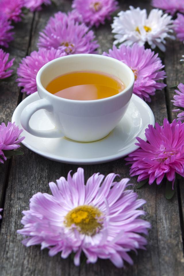 Wallpaper White cup of tea on a table with asters