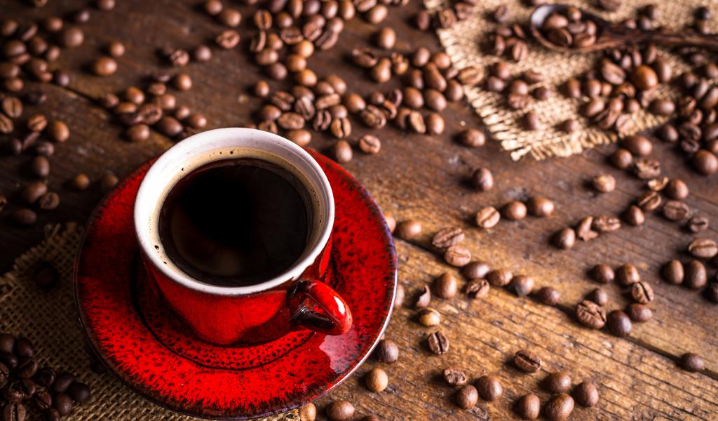 Wallpaper Red coffee cup on a table with coffee beans