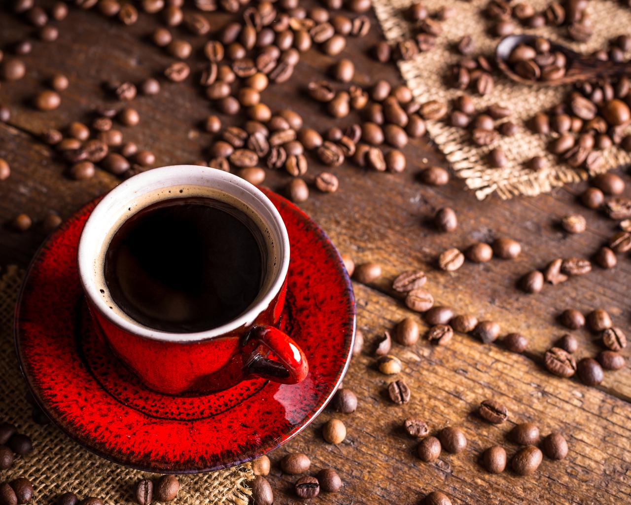 Wallpaper Red coffee cup on a table with coffee beans