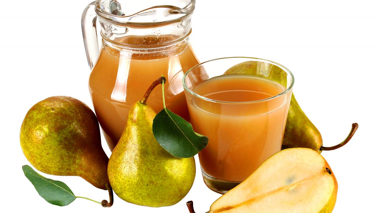 Wallpaper Pear juice with fresh pears on a white background